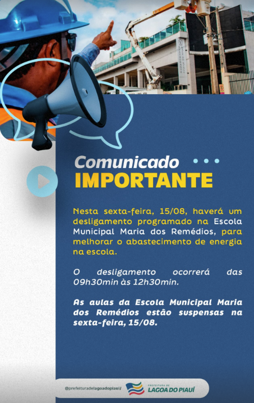 A Prefeitura de Lagoa do Piauí informa que, nesta sexta-feira, 15 de agosto, haverá um desligamento programado de energia na Escola Municipal Maria dos Remédios, visando melhorar o abastecimento de energia no local. O desligamento ocorrerá das 09h30 às 12h30, e, por precaução, as aulas da escola estarão suspensas durante este período.