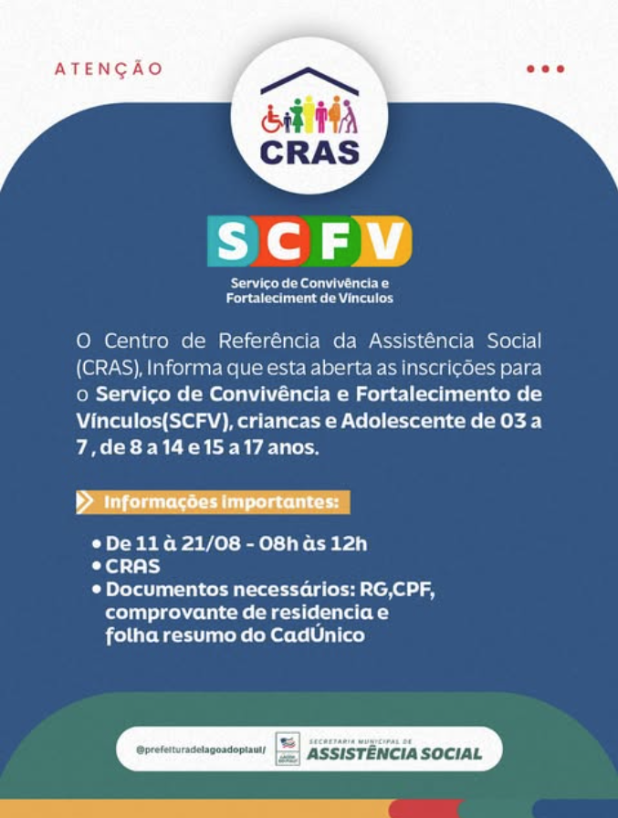 O Centro de Referência da Assistência Social (CRAS) de Lagoa do Piauí está com inscrições abertas para o Serviço de Convivência e Fortalecimento de Vínculos (SCFV). O programa atende crianças e adolescentes de 3 a 17 anos, oferecendo atividades socioeducativas.