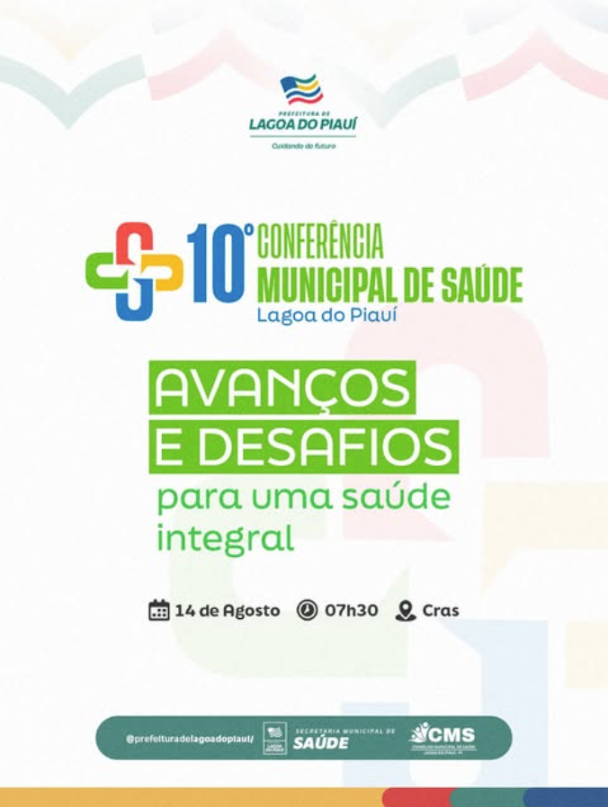 A Prefeitura Municipal de Lagoa do Piauí, por meio da Secretaria Municipal de Saúde e do Conselho Municipal de Saúde, convida a população para participar da 10ª Conferência Municipal de Saúde, que acontecerá no dia 14 de agosto, às 7h30, no CRAS.