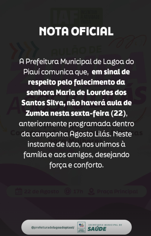 A Prefeitura Municipal de Lagoa do Piauí comunica que, em sinal de respeito pelo falecimento da senhora Maria de Lourdes dos Santos Silva, não haverá aula de Zumba nesta sexta-feira (22), anteriormente programada dentro da campanha Agosto Lilás. Neste instante de luto, nos unimos à família e aos amigos, desejando força e conforto.
