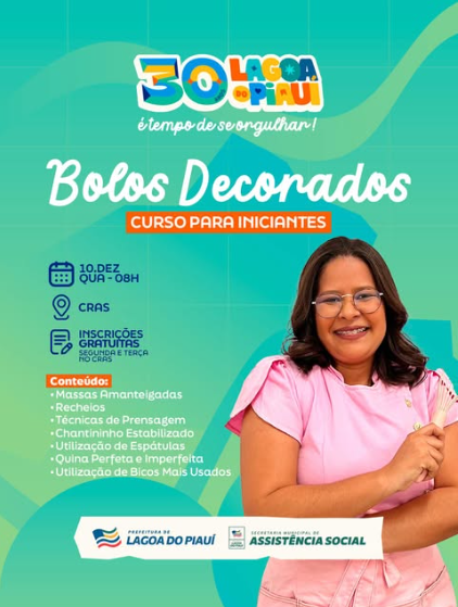A Prefeitura de Lagoa do Piauí, por meio da Secretaria Municipal de Assistência Social, segue incentivando a qualificação profissional e ampliando oportunidades para a população. Nesta quarta-feira, dia 10 de dezembro, será realizado o curso “Bolos Decorados para Iniciantes”, com início às 8h, no CRAS.