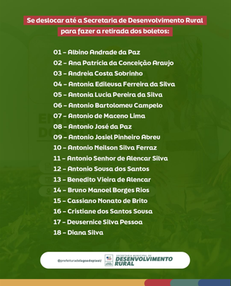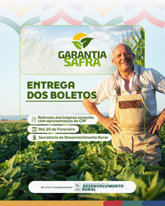 A retirada do boleto deve ser realizada mediante apresentação do CPF, até o dia 20 de fevereiro, na Secretaria Municipal de Desenvolvimento Rural.