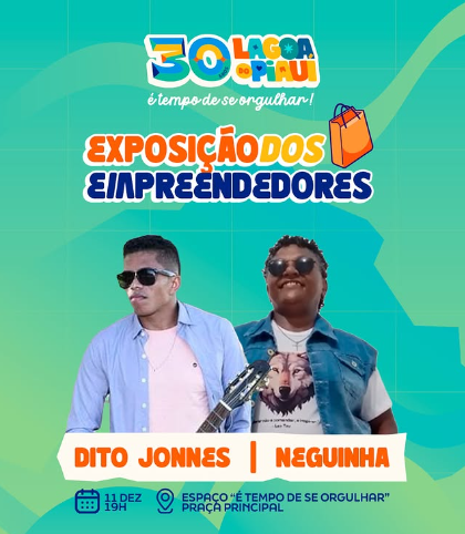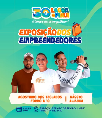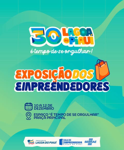A Prefeitura Municipal de Lagoa do Piauí convida toda a população para prestigiar a Exposição dos Empreendedores, que acontecerá de 10 a 12 de dezembro, no espaço “É Tempo de se Orgulhar”, localizado na Praça Principal.