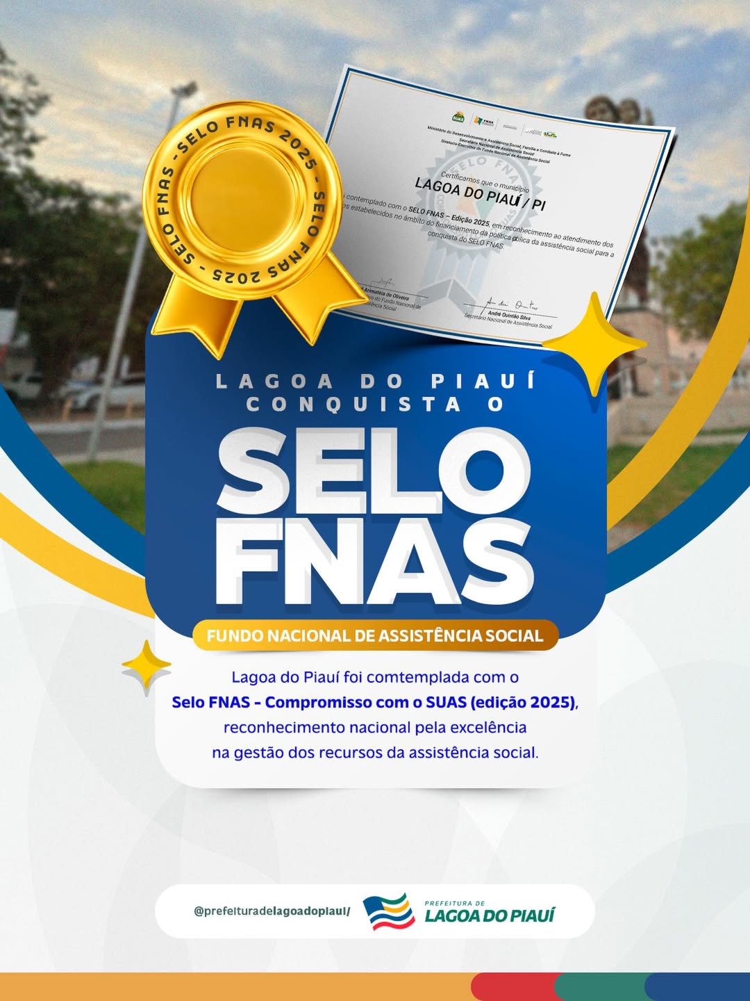 A Prefeitura Municipal de Lagoa do Piauí celebra mais uma importante conquista: o município foi reconhecido com o Selo FNAS – Compromisso com o SUAS (Edição 2025), certificação nacional concedida pelo Fundo Nacional de Assistência Social às gestões que se destacam pela responsabilidade e eficiência na aplicação dos recursos públicos.