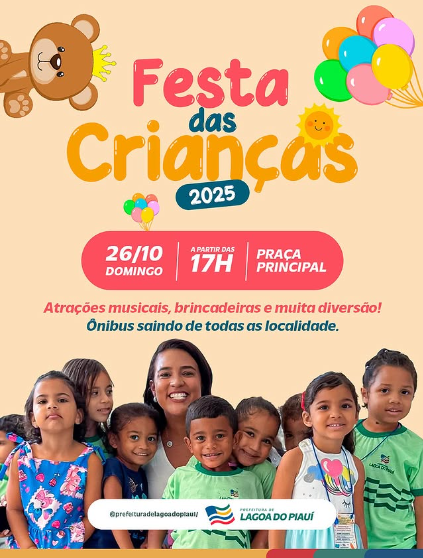 Preparem-se para um dia mágico! No próximo dia 26 de outubro, a Praça Principal de Lagoa do Piauí será palco de muita alegria, música, brincadeiras e diversão com a Festa das Crianças 2025 — um evento preparado com todo carinho pela Prefeitura Municipal de Lagoa do Piauí para celebrar a infância e proporcionar momentos inesquecíveis para os pequenos lagopiaienses.