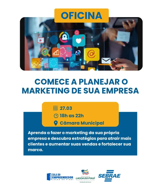 A oficina será realizada no dia 27 de março, das 18h às 22h, na Câmara Municipal de Lagoa do Piauí, reunindo participantes interessados em aprimorar suas estratégias e ampliar a visibilidade de suas empresas.