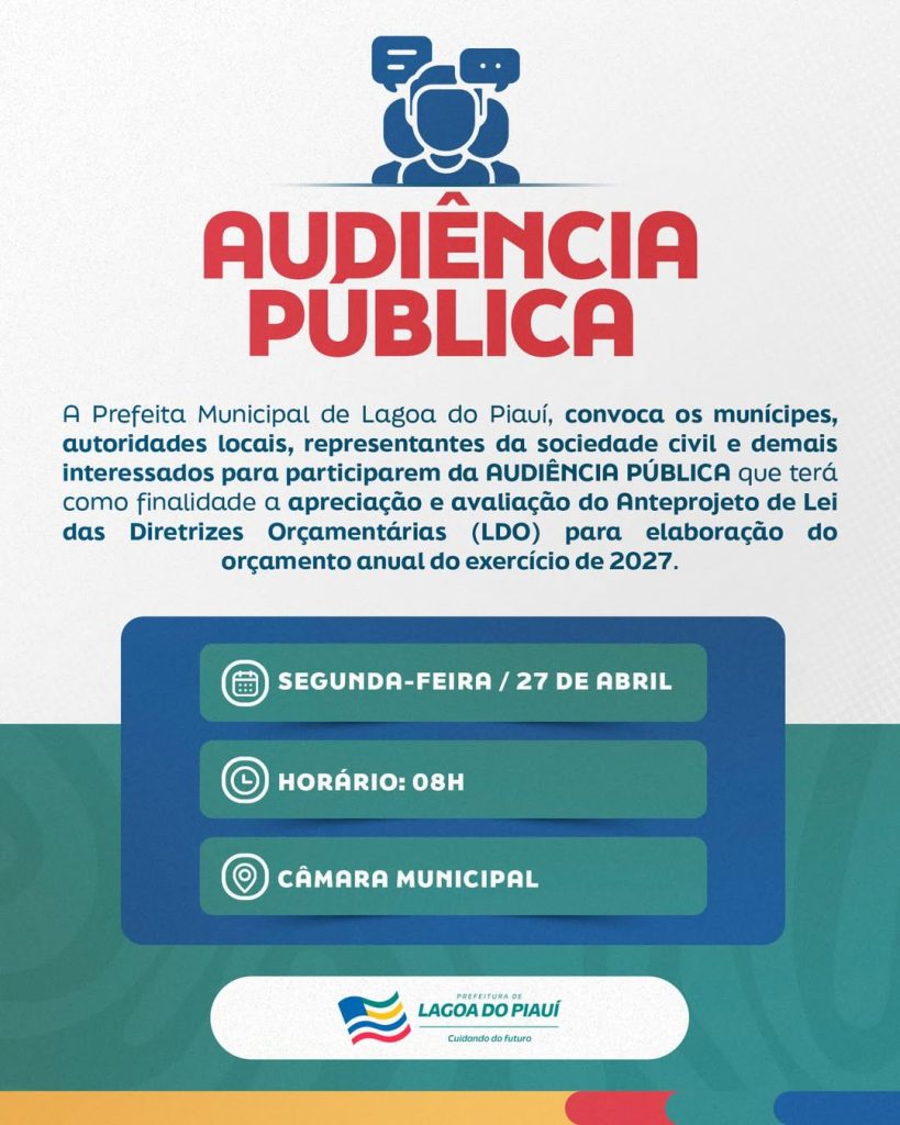 A Audiência Pública será realizada na Câmara Municipal de Lagoa do Piauí, na segunda-feira, 27 de abril, com início às 8 horas da manhã. Serão apresentados e discutidos temas como as metas e prioridades da administração municipal para 2027, as despesas de capital e custeio, as projeções de receita, os riscos fiscais e as diretrizes para as emendas ao orçamento.