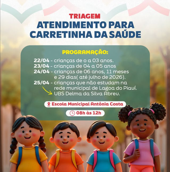 A Prefeitura Municipal de Lagoa do Piauí, por intermédio da Secretaria Municipal de Saúde, informa à população o cronograma de triagem para o atendimento da Carretinha da Saúde, ação itinerante que ofertará serviços médicos, odontológicos e nutricionais às crianças do município. Os pais ou responsáveis devem ficar atentos às datas, locais e horários para garantir a participação de seus filhos.